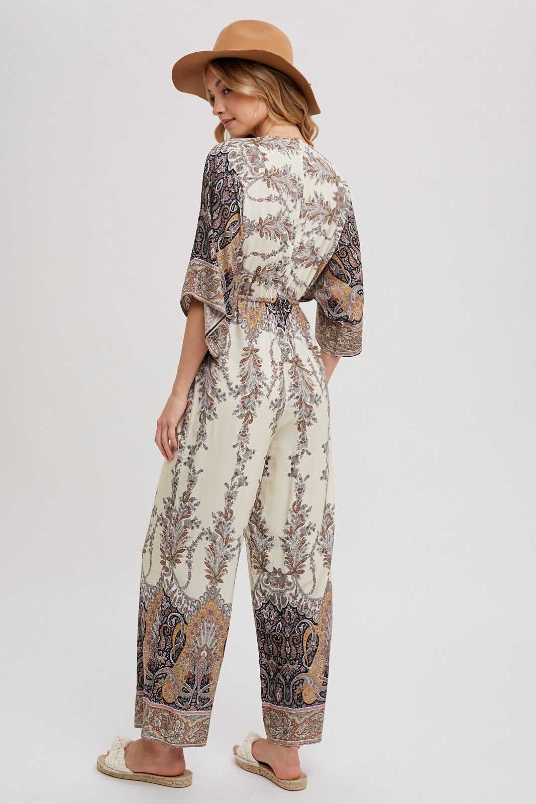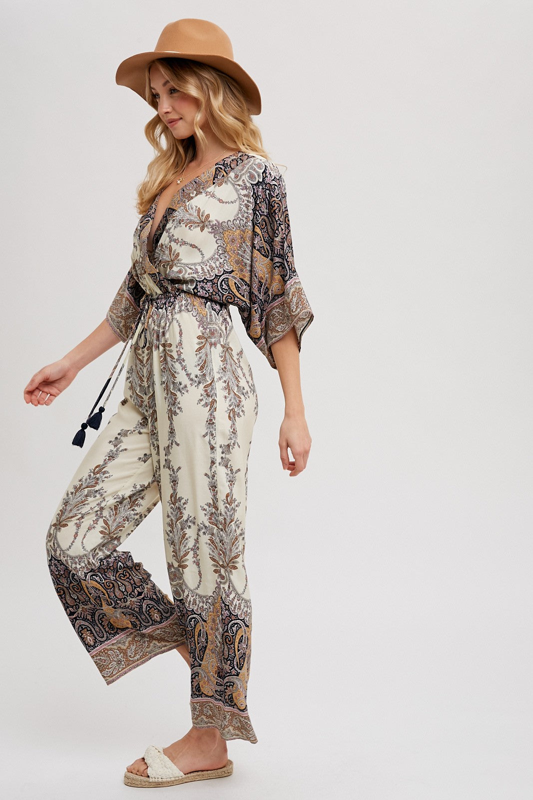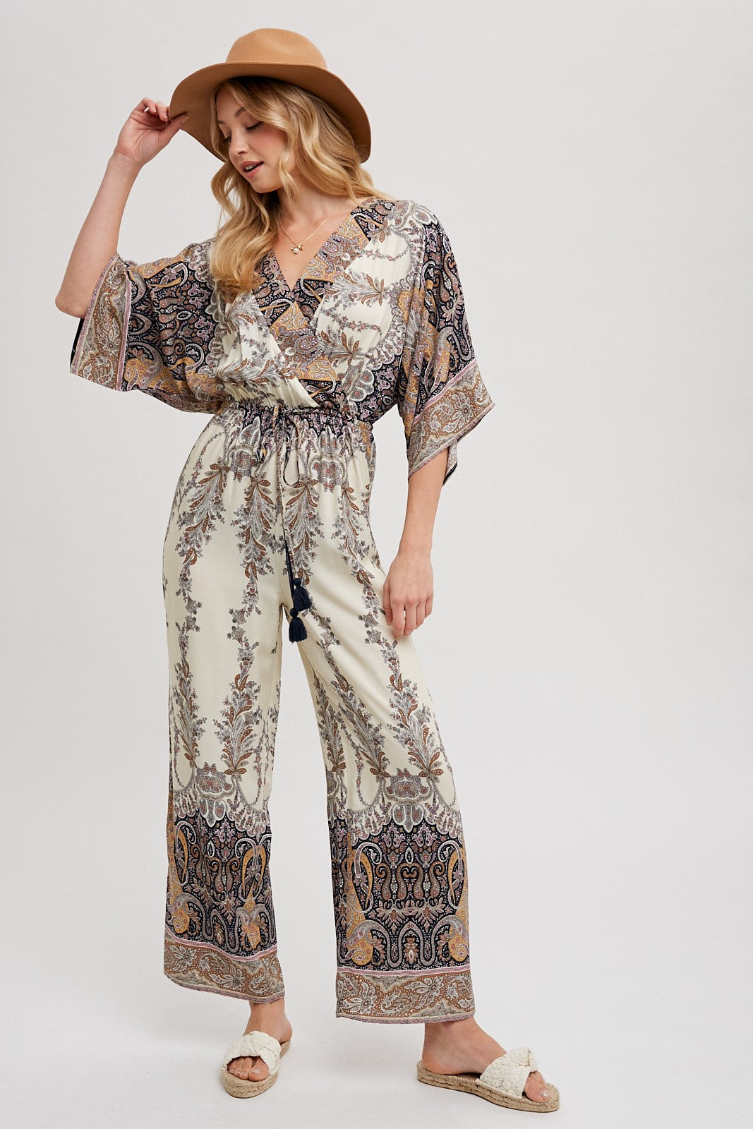 The Paisley Print Wrap Jumpsuit with Drawstring is a stylish