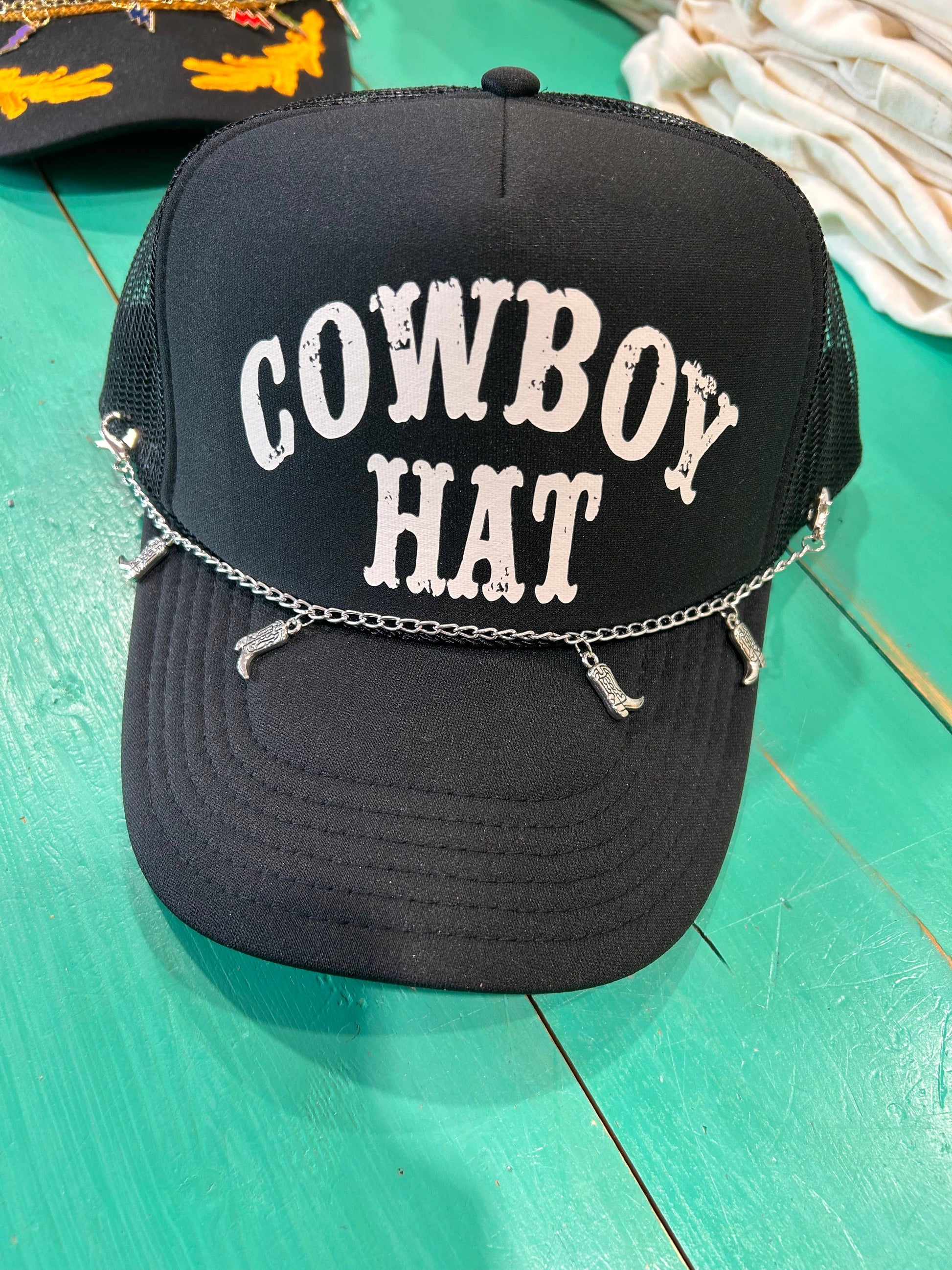 Cute Cowboy Hat trucker hat chain with cowboy boot charms. Each chain has lobster claws so you can add extra flair to your favorite trucker hats!