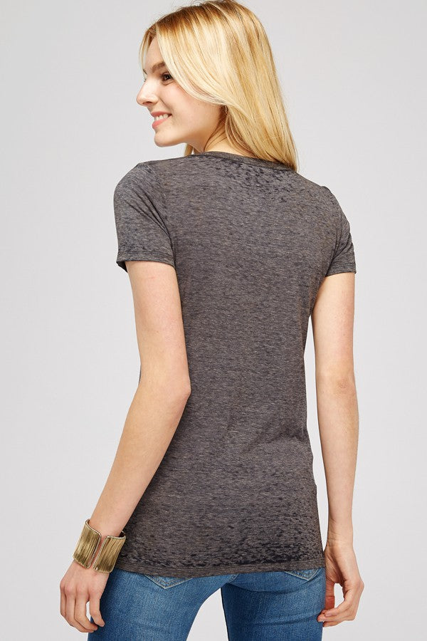 Burnout washed Dark Charcoal V-neck Tee shirt with "LIVE FREE" American Flag Embellished Graphic wear it for 4th of July or just because you love America!